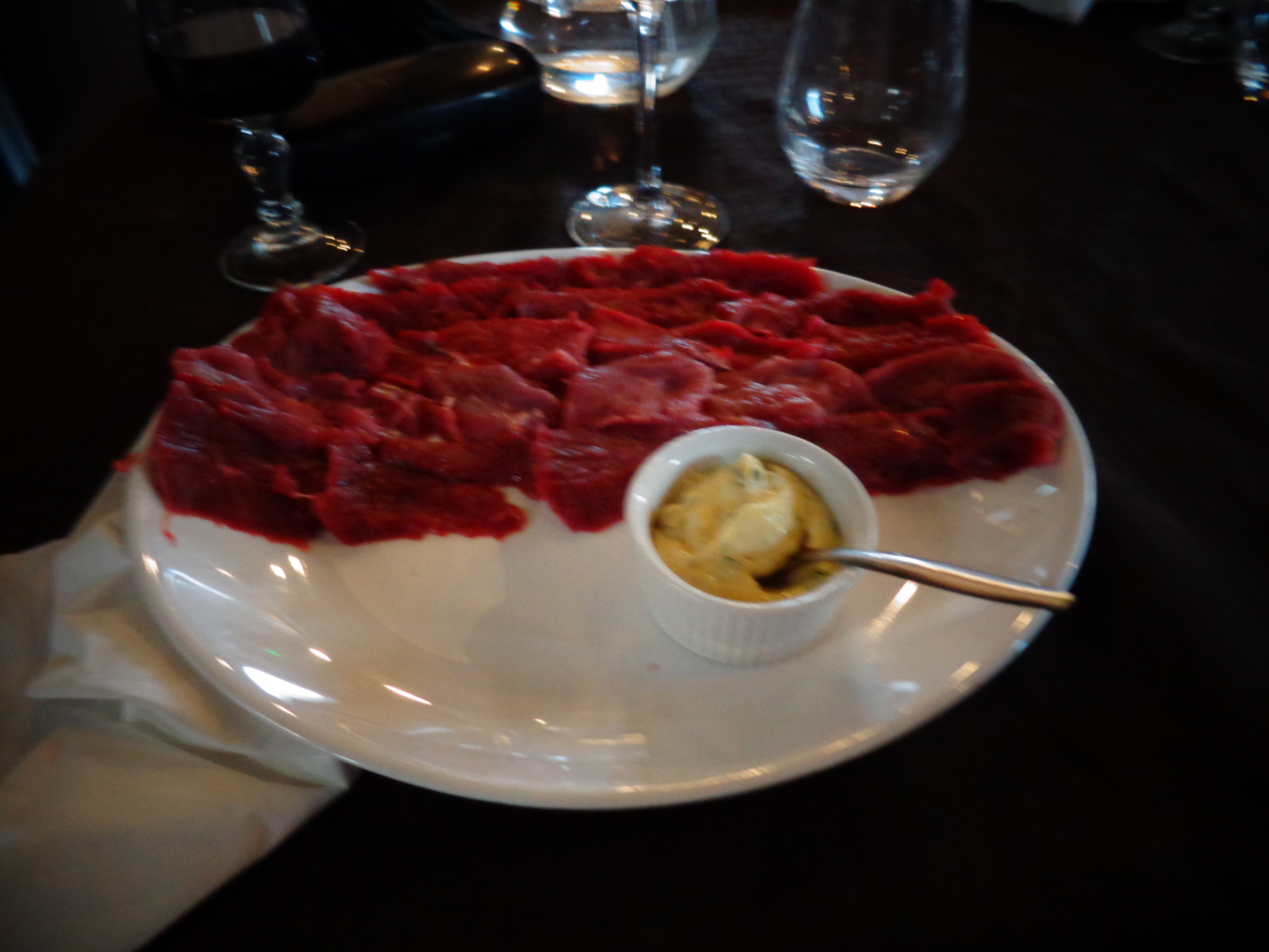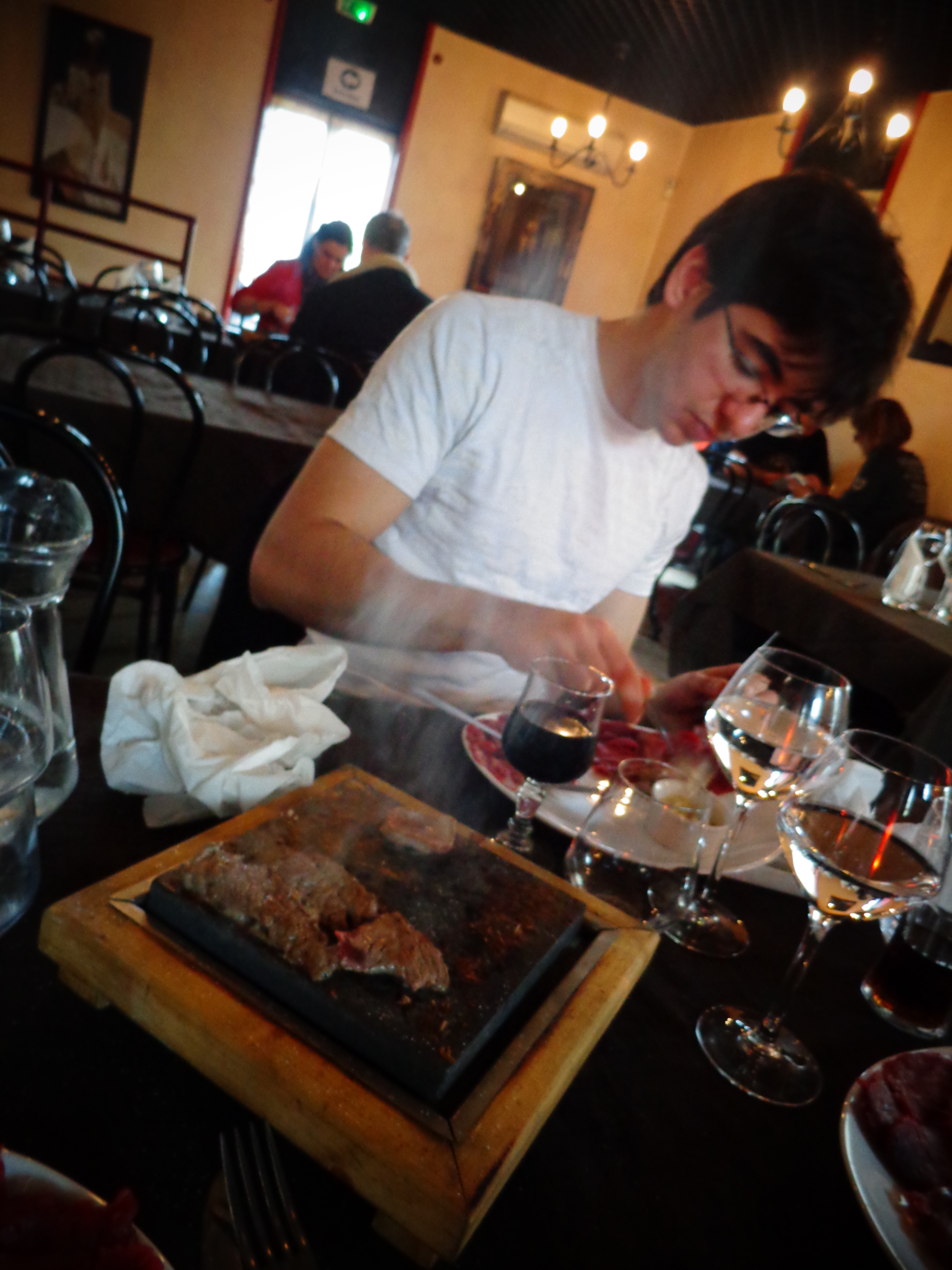 Quando chegamos a fome e o frio eram grandes, então paramos no restaurante “Le Veneur Noir” e pedimos carne na pedra, uma espécie de sashimi de carne, com um molho divino, e por acompanhamento, batatas cozidas, e vinho da casa. A pedra é colocada na mesa, numa temperatura de 400 graus(informação da proprietária), temperada com sal e pimenta. Cada um vai colocando suas lâminas na pedra e pegando depois que está cozida, uma delícia!