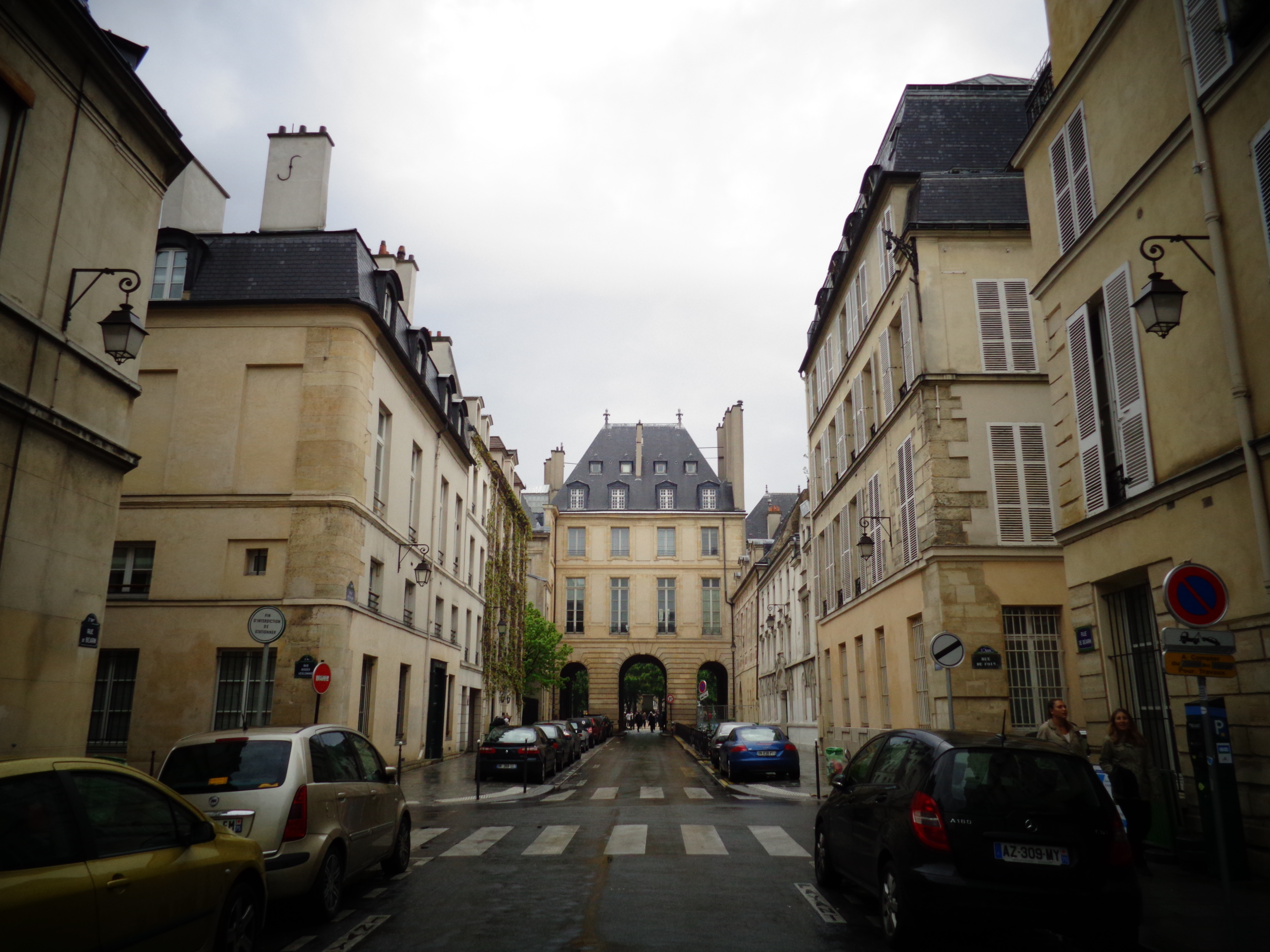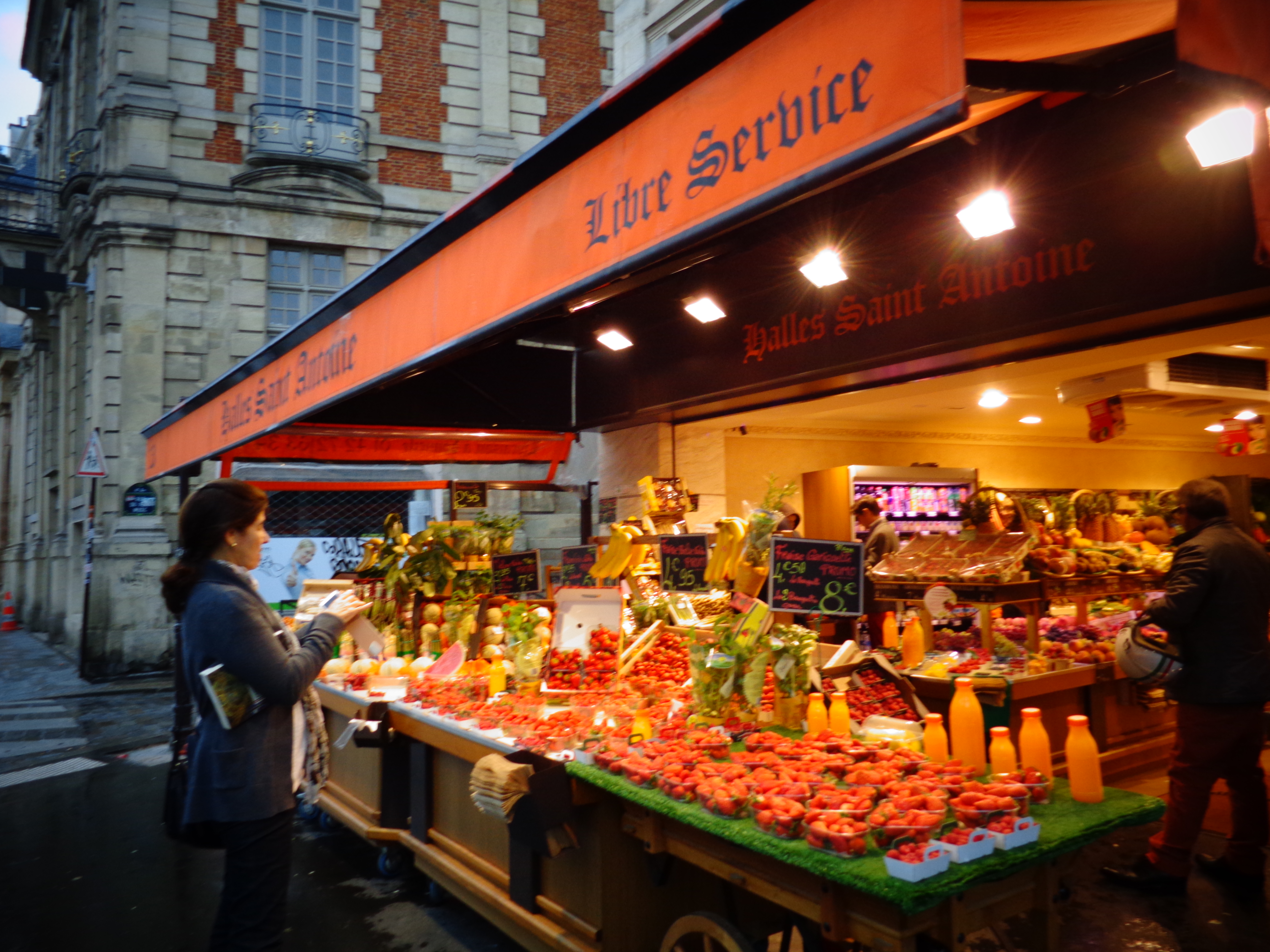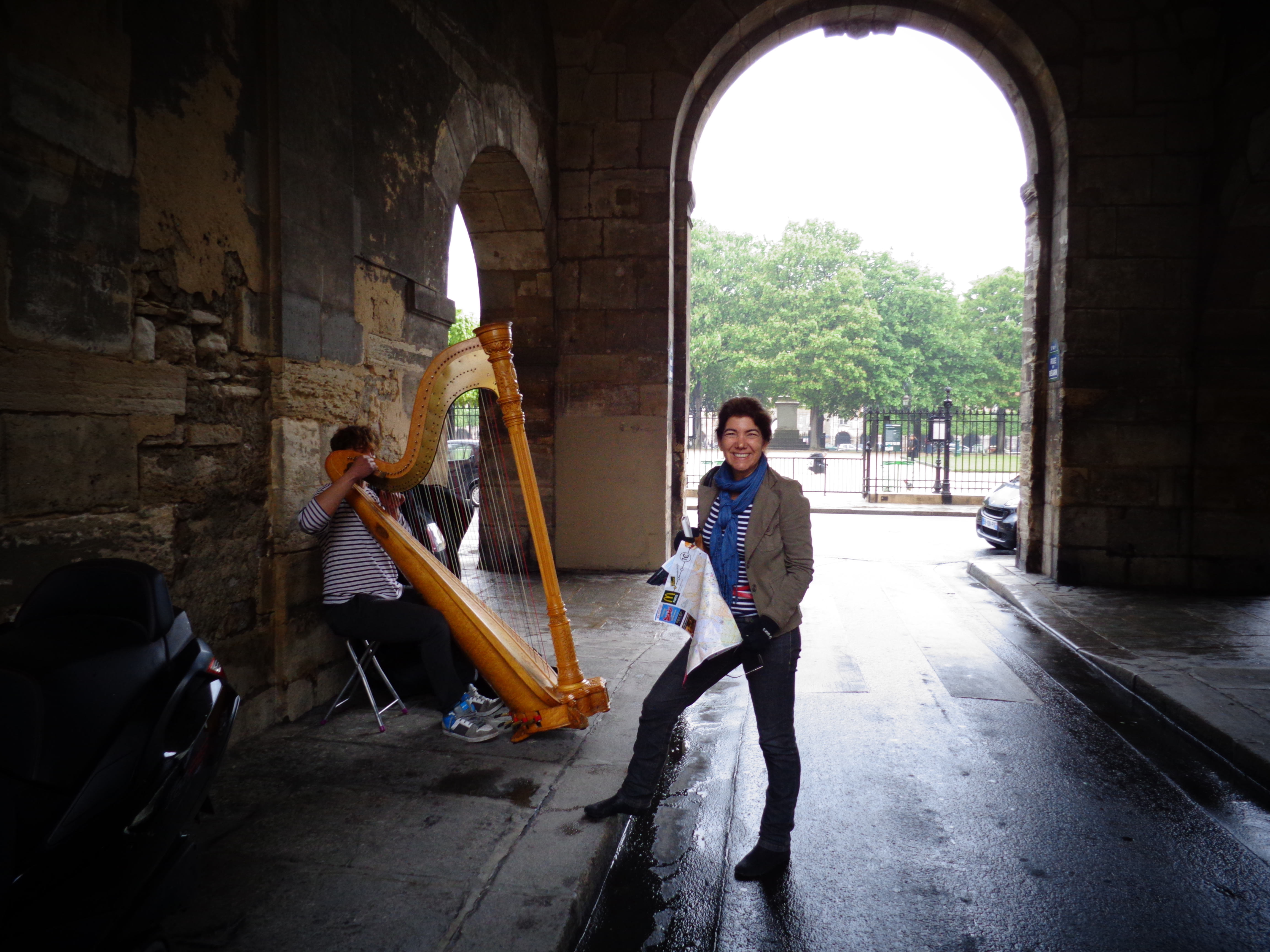 A praça em torno da Catedral de Saint-Denis, estava deserta, fria e assustadora,  e como não poderiamos conhecer o interior da Catedral naquele dia,  resolvemos não perder mais tempo e ir passear em outro lugar. O destino escolhido foi a Place de Vosges, pois estava no roteiro do livro de Ina Caro. Eu tinha estado lá recentemente como relatei num post aqui, mas Teena não conhecia ou não se lembrava. Pegamos o metro e descemos na estação de Champs-Élisées para pegar a linha 1 e descer na estação Saint-Paul.  Como chovia muito paramos num café para comer e esperar a chuva passar, depois lamentamos termos parado logo no primeiro café, pois na praça, as opções eram bem melhores, além de ser mais agradável. Depois de rodar pela praça, olhar galerias, lojas e bater fotos, claro, seguimos adiante. Ficamos encantadas com um tocador de harpa na saída da Place de Vosges,  depois com um mercado na Rue de Saint-Antoine, e com tudo mais  que foi aparecendo no nosso caminho.