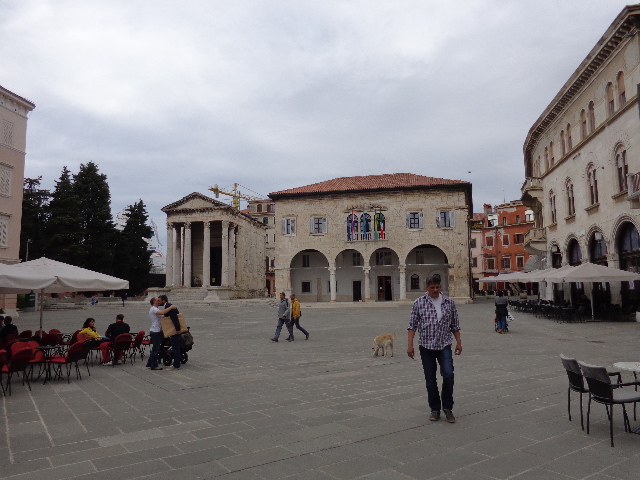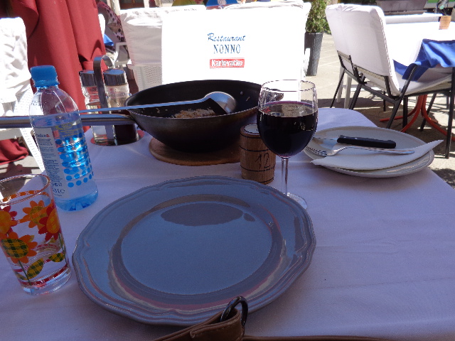 O centro de Pula no mapa pode ser identificado pela concentração de quadrados amarelos, que são os monumentos históricos. Fui percorrendo as ruas por onde ainda não tinha passado e parei na praça do forum para almoçar. Eram muitas opções, então fui pelo feeling e acertei em cheio, com um prato típico do lugar: risoto de frutos do mar.